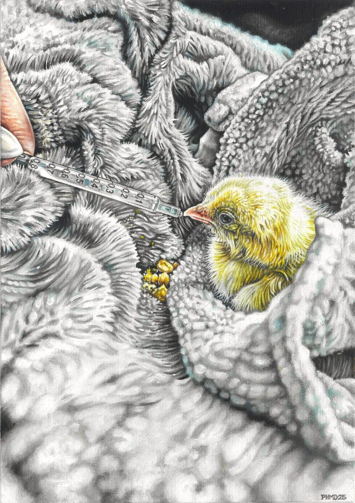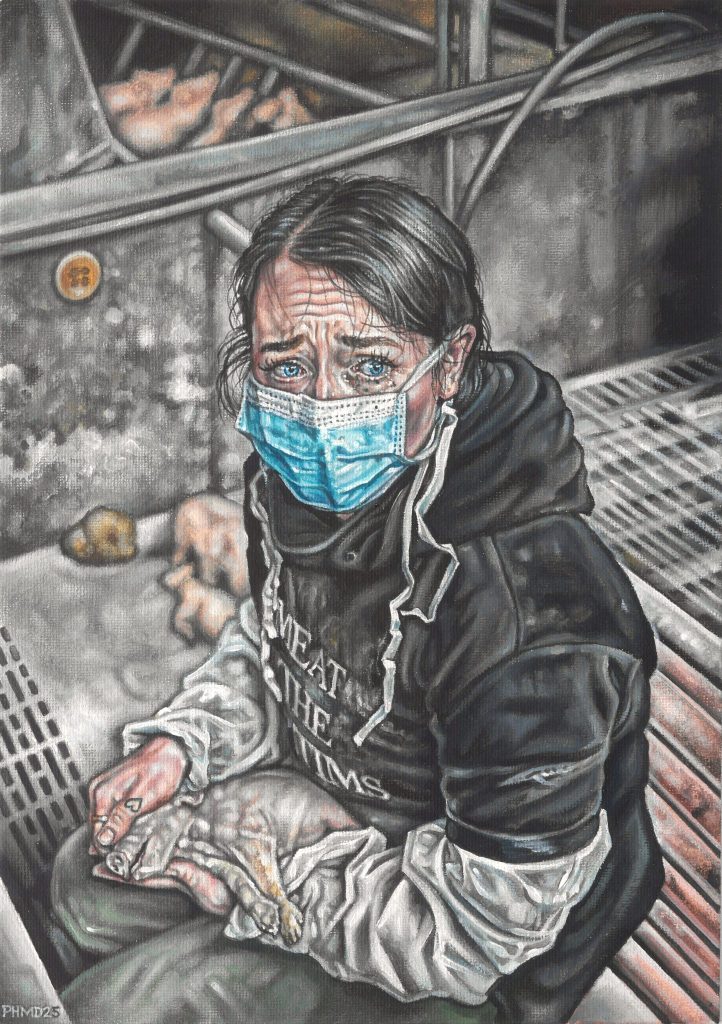 In my seven years of producing work as an animal rights artist, these have proved to be the most technically difficult and emotionally charged pieces that I’ve ever created. Thanks to having access to brilliant photographs taken at ‘Animal Save’ vigils, factory farm rescues and on sanctuaries, I’ve attempted to capture the strength, compassion, trauma and joy of activists as they perform acts of the highest moral courage. These unsung, everyday heroes form the very heart of the animal rights movement, and I wanted to pay tribute in the only way I can to people I regard as the most humane of all humans.